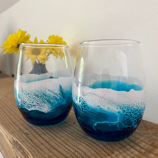 Pair Of Ocean Inspired Wine Glasses with Hand Poured Resin Waves