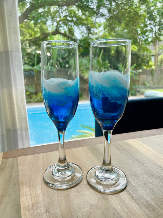 Pair of Ocean Inspired Champagne Glasses with Hand Painted Resin Waves